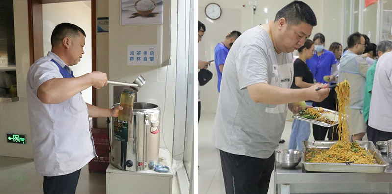 食堂還為所有職工貼心準(zhǔn)備了消暑解渴的免費(fèi)涼茶,配方有金銀花、菊花、蒲公英、甘草等,既能防暑,又有清熱化濕、提神醒腦等功效。清爽開(kāi)胃的涼面,拌一拌,食欲滿滿。