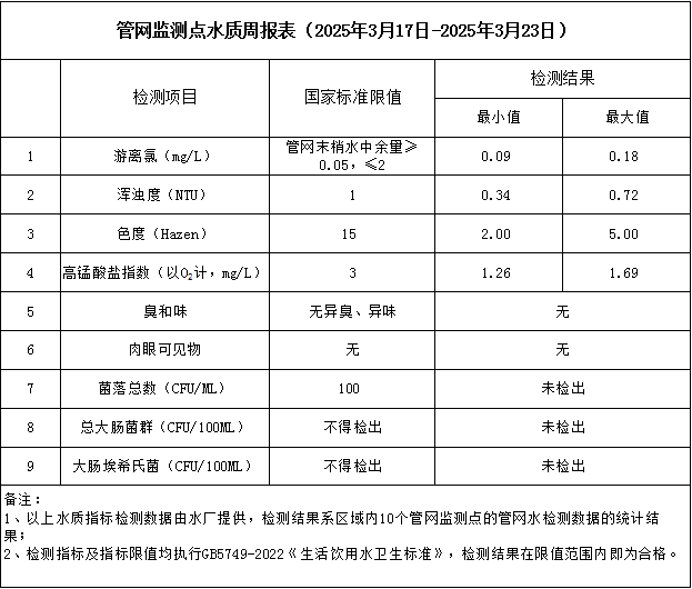 管網(wǎng)監(jiān)測點水質周報表(2025年3月17日-2025年3月23日)