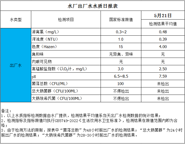 水廠出廠水水質(zhì)日?qǐng)?bào)表(2025-5-21)