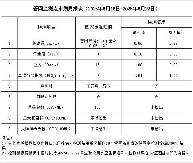 管網(wǎng)監(jiān)測(cè)點(diǎn)水質(zhì)周報(bào)表(2025年6月16日-2025年6月22日)