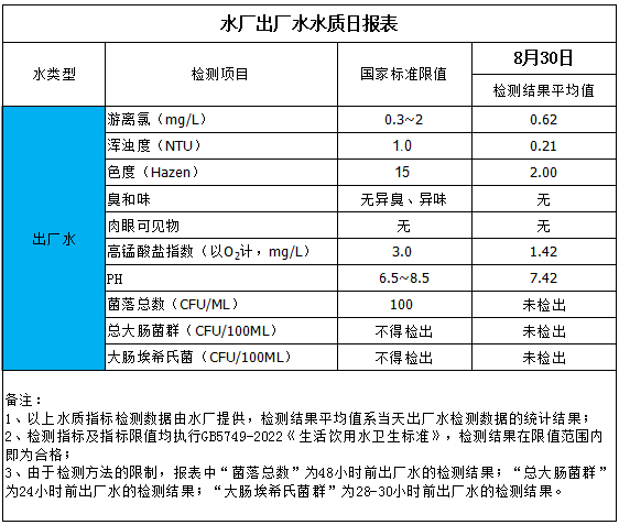 水廠出廠水水質(zhì)日?qǐng)?bào)表(2025-8-30)