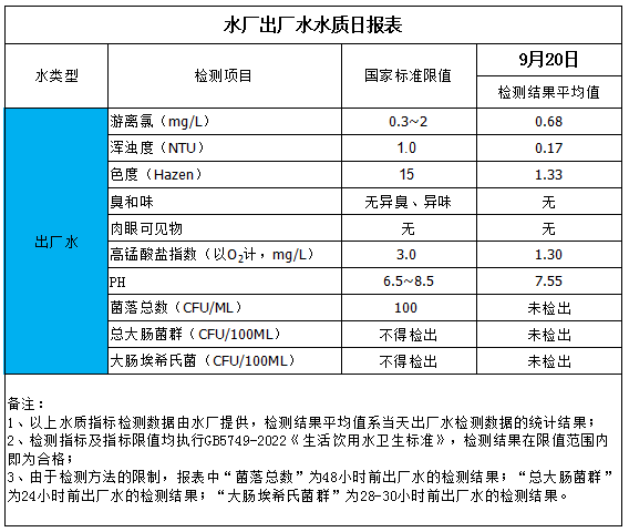 水廠出廠水水質(zhì)日?qǐng)?bào)表(2025-9-20)