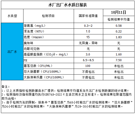 水廠出廠水水質(zhì)日?qǐng)?bào)表(2025-10-11)