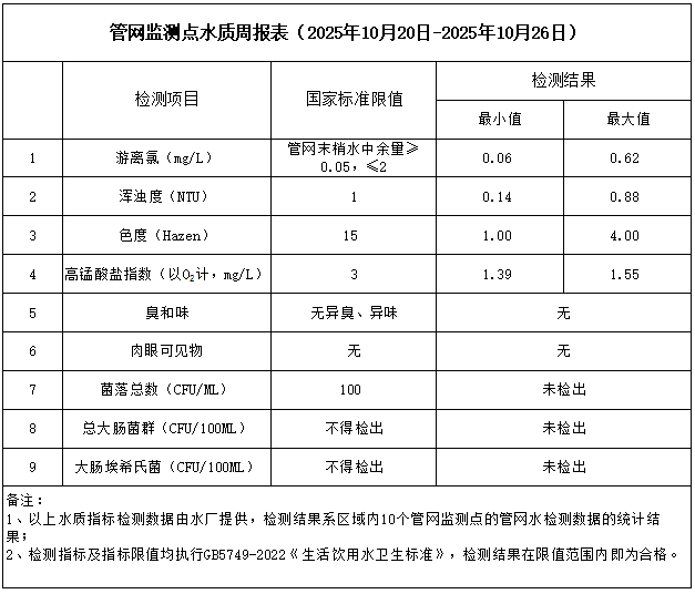 管網(wǎng)監(jiān)測(cè)點(diǎn)水質(zhì)周報(bào)表(2025年10月20日-2025年10月26日)