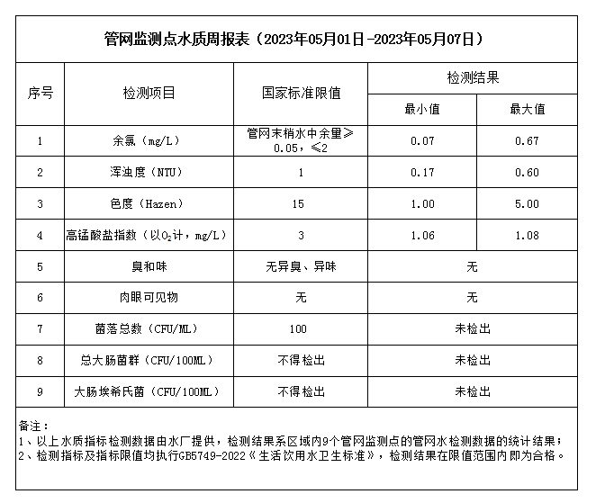 管網(wǎng)監(jiān)測(cè)點(diǎn)水質(zhì)周報(bào)表(2023年05月01日-2023年05月07日)