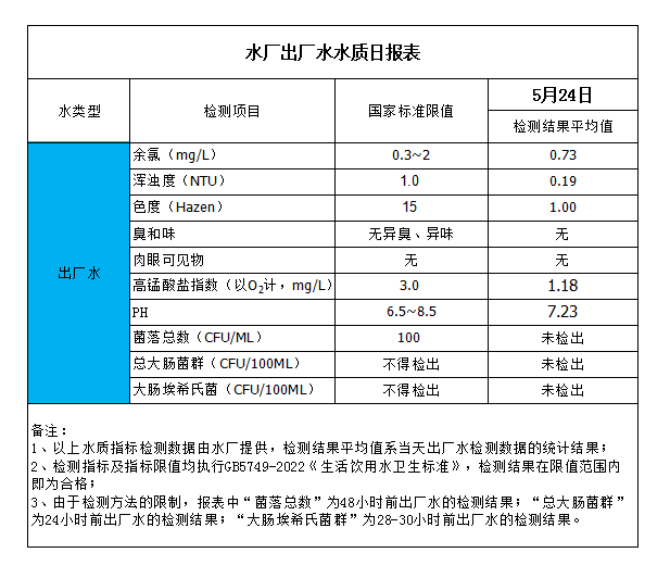 水廠出廠水水質(zhì)日報表(2023-5-24)