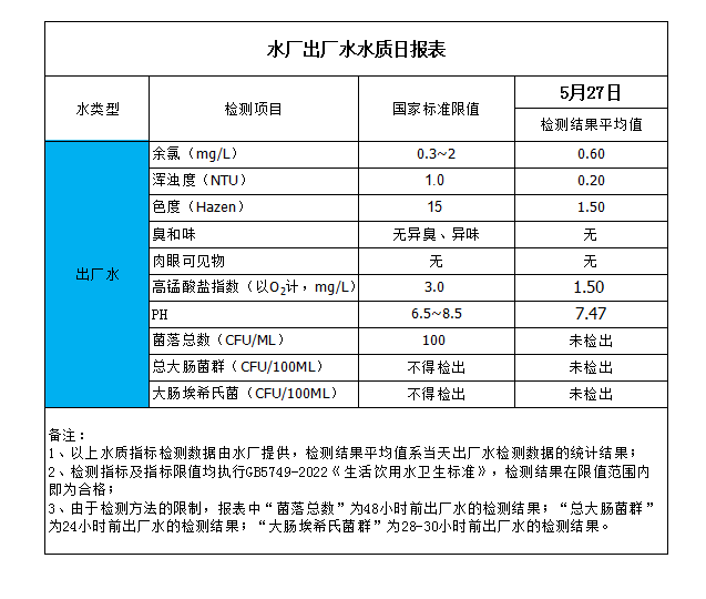 水廠出廠水水質(zhì)日報表(2023-5-27)