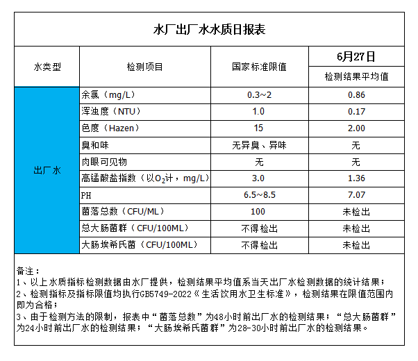 水廠出廠水水質(zhì)日?qǐng)?bào)表(2023-6-27)