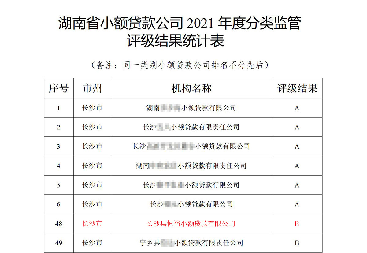被湖南省金融辦監(jiān)管評級為B級資質單位。